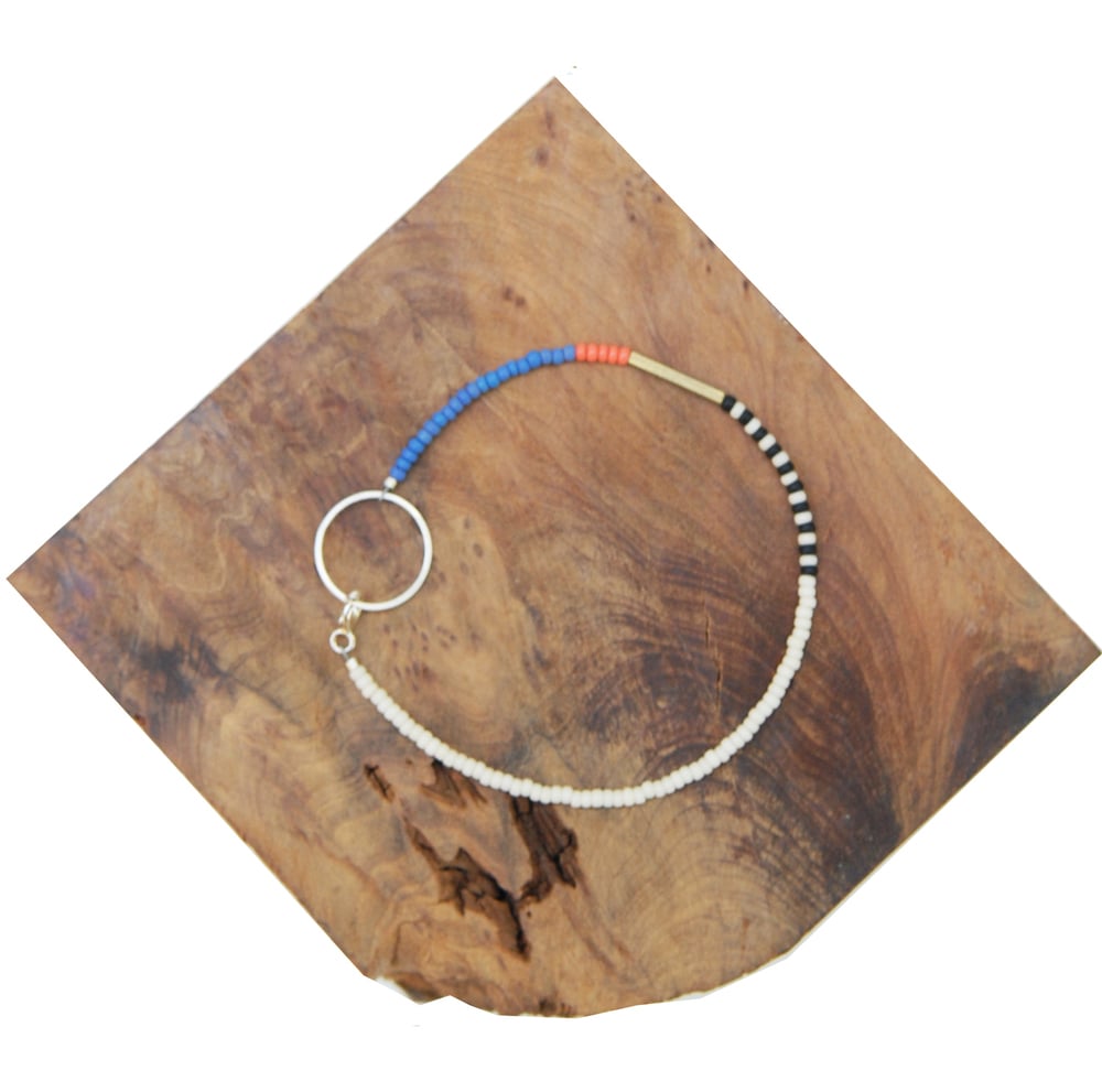 Handmade sterling silver circle clasp with brass bar bead and Japanese and Czech seed beads.